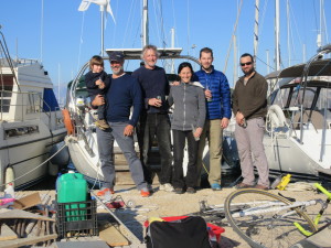 And finally here’s the current crew. Left to right that’s Nathan in the arm of Martin, who we hope to pick up in Italy to help us get to Gibralter. He had to bail out short term as two more departure dates bit the dust. Then the grizzled old guy, followed by Lilas, who will be rejoining us in the Canaries with the little guy. Then Alexandre and Sylvain. Work to do and delays notwithstanding, life here doesn’t look so bad, does it?
